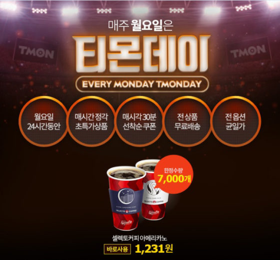 이번 행사에선 오전 9시 셀렉토커피 아메리카노 7,000개를 1,231원에, 12시에는 제주 인하네 농장직송 꿀귤 5kg 상품 100개 한정 990원에 판매한다. 13시에는 티웨이 제주 편도항공권 100개 4,900원, 17시에는 삼익가구 일체형 본넬스프링 싱글 소파베드 15개 1만 9,900원, 18시에는 아이오페 에어쿠션 본품+리필 150개 9,900원에 판매한다. 23시에는 플레이스테이션4 슬림 1TB 본체와 스파이더맨 게임 번들 상품을 10개 한정 19만 9,000원에 판매한다. 티몬데이 기간 중에는 매 시각 30분마다 최대 605 할인 선착순 타임쿠폰도 증정한다.