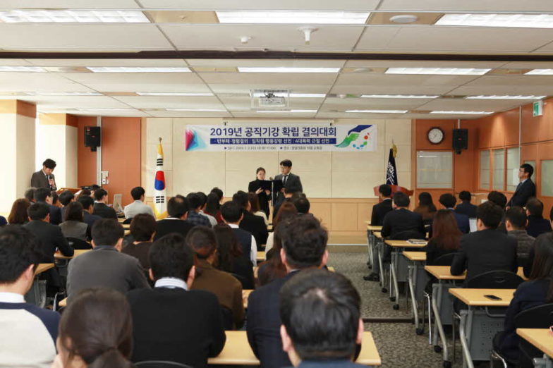 창업진흥원이 1월 2일 대전 둔산동 교육장에서 2019년 창업진흥원 공직기강 확립 결의대회를 개최했다. 공정하고 투명한 직무 수행과 청렴한 조직 문화 형성을 위해 반부패와 청렴 결의, 임직원 행동 강령 선언, 4대 폭력 근절 선언을 실시하는 자리를 가진 것.