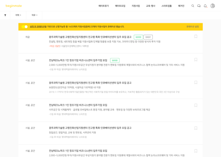 비긴메이트가 지원 사업 큐레이션 서비스를 시작한다고 밝혔다. 1만 2,000여 개에 이르는 지원 사업 가운데 스타트업이 신청 가능한 것만 찾아주는 것.