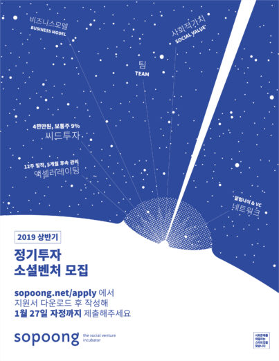 에스오피오오엔지(sopoong)가 오는 27일까지 상반기 투자 소셜벤처를 모집한다. 선발된 팀에는 4천만원 투자와 12주 액셀러레이팅이 제공되며 선발 대상은 사회문제 해결을 목적으로 하는 스타트업이다. 사회문제 인식과 비즈니스 모델이 있으면 아이디어 단계에서도 지원할 수 있다.