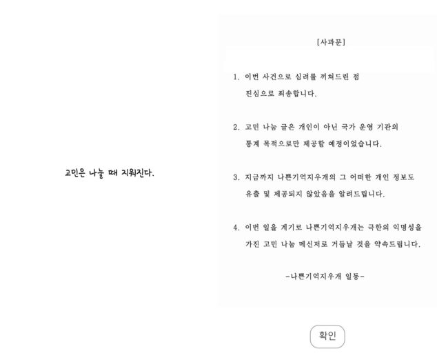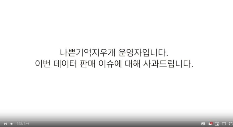 사태가 진정되지 않자 나쁜기억지우개 측은 5일 고민 나눔 글 데이터 판매 이슈 해명과 사과 영상을 내놨다. 운영자는 “국가 지원 사업과 투자금으로 운영비를 충당하던 중 2018년 한국데이터산업진흥원 데이터 바우처 지원 사업에 선정됐다”고 밝혔다. 데이터 바우처 사업은 데이터 활성화를 위해 기업과 기관이 데이터를 거래할 수 있도록 작년 8월 마련된 사업이다. 나쁜기억지우개 측 또한 이 사업을 통해 데이터를 신뢰할 수 있는 기관에 연구나 통계 목적으로 판매할 계획이었다고 밝혔다.