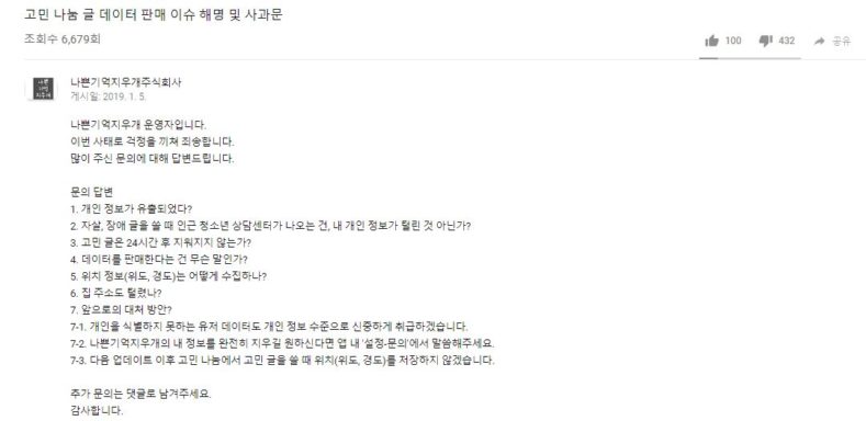 운영자는 “이 과정에서 개인 정보를 식별이 불가능, 통계용으로 적합하다고 판단했으며 이 과정에서 이용자의 의견을 구하지 않고 실망감을 안겨 사죄한다”고 답했다. 데이터 판매 시도는 2018년 10월 한국데이터산업진흥원 데이터스토어에 올라온 1건이 전부며 아직 단 한 건도 판매하지 않은 상태다. 나쁜기억지우개 측은 문제가 불거지자 5일 해당 판매 글을 내렸다.