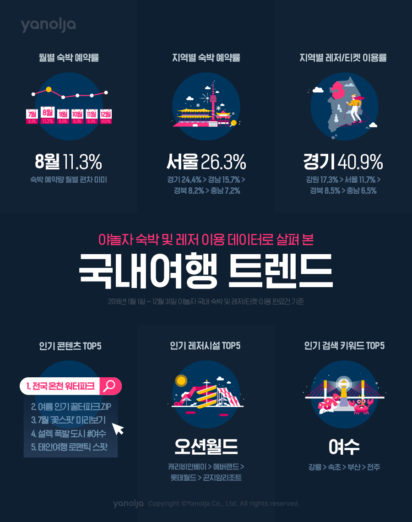 야놀자 앱에서 이용자들이 가장 많이 검색한 키워드는 여수, 강릉, 속초, 부산, 전주 등 지역명인 것으로 확인됐다. ‘야놀자 캐스트’라는 이름으로 발행되는 여행/레저 콘텐츠 조회수는 1위 ‘추울수록 더 좋아! 전국 온천 워터파크’, 2위 ‘스릴만점 주의! 꿀잼 터지는 전국 꿀터파크.zip’, 3위 ‘미모열일은 기본! 7월 ‘꽃스팟’ 미리보기’, 4위 ‘언제나 설렘폭발 1위 도시, #여수’, 5위 ‘1박2일 태안여행 로맨틱 패키지 스팟’순으로 나타났다.