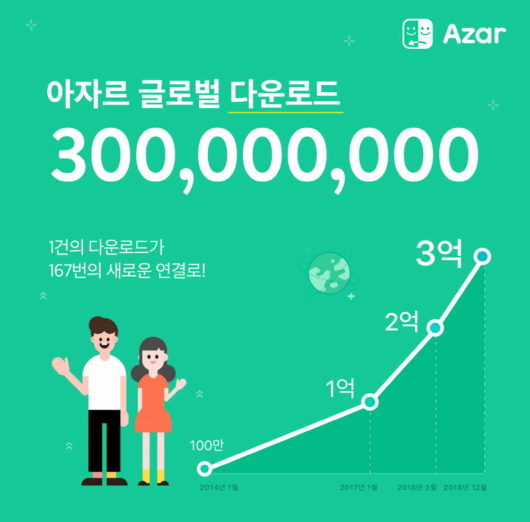 아자르(Azar)가 누적 다운로드 3억 건을 달성했다. 2018년 3월 2억 돌파 이후 9개월 만에 다시 1억 건을 더 추가한 것. 누적 매치도 1월 500억 건을 기록해 다운로드 1건당 167건에 이르는 새로운 연결을 만들어냈다.