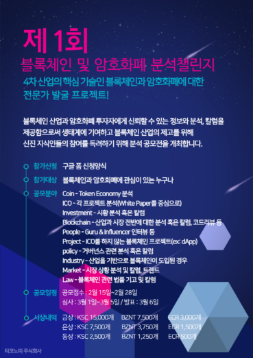 참여형 블록체인 미디어 티코노미가 2월 28일까지 ‘4차산업혁명의 핵심 기술인 블록체인과 암호화폐’를 주제로 제1회 블록체인 및 암호화폐 분석 챌린지 공모전을 개최한다고 밝혔다.