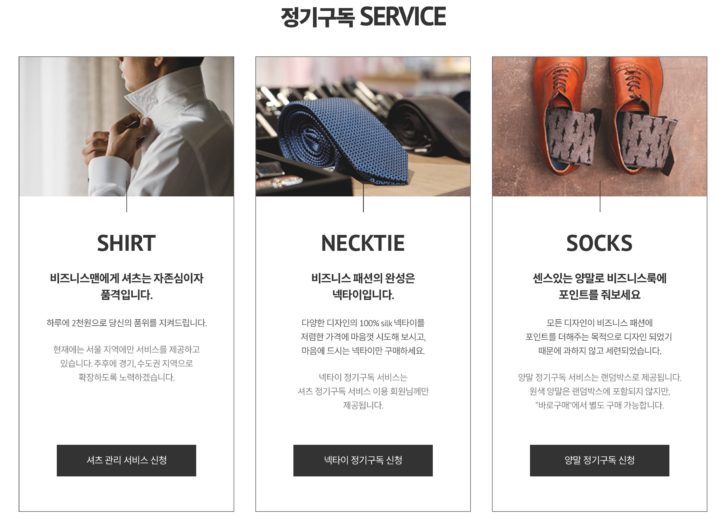 남성만을 위한 셔츠, 넥타이, 양말 종합 구독 서비스인 맨즈캐비넷이 출시됐다. 맨즈케비넷의 셔츠 관리 서비스는 입고 난 셔츠를 직접 수거해서 세탁하고 다림질해 돌려준다. 비용은 셔츠 3벌에 2만9,000원, 5벌에 4만9,000원으로 서울 소재 세탁소의 평균 셔츠 세탁 비용이 한 벌당 3천 원인 것을 고려할 때 20%가량 저렴한 비용으로 배송 서비스까지 누릴 수 있다.