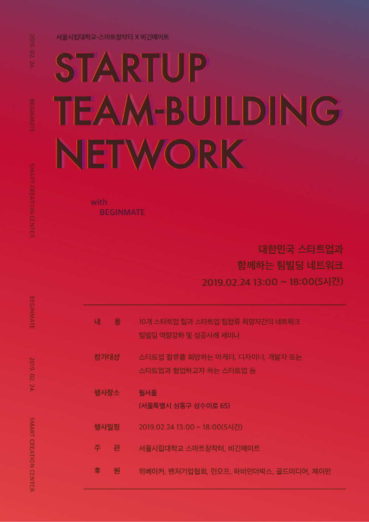 비긴메이트와 서울시립대학교 스마트창작터가 2월 24일 서울 성동구 월서울에서 스타트업 팀빌딩 네트워킹 행사를 개최한다.