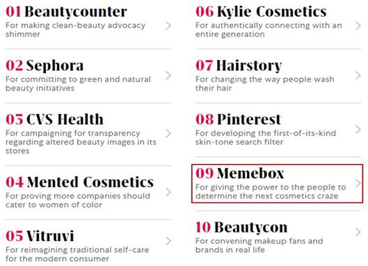 미미박스와 더불어 월트디즈니컴퍼니, 알리바바 그룹, 애플 등이 세계 50대 혁신 기업으로 선정됐다. 뷰티 부문에서는 친환경 뷰티 기업 ‘뷰티카운터’, 세계 최대 뷰티 유통 기업 ‘세포라’, ‘카일리 코스메틱’ 등이 함께 이름을 올렸다.