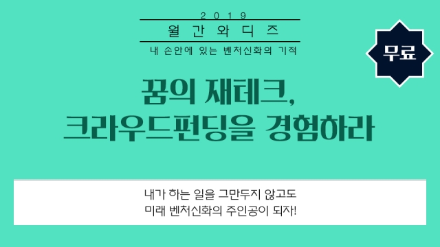 ◇ [2월 25일 월] 꿈의 재테크, 크라우드펀딩을 경험하라=뉴미디어 스타트업 사이다경제가 크라우드펀딩 플랫폼 와디즈와 손잡고 2019 월간 와디즈 무료 세미나를 오는 2월 25일 19시 30분부터 여의도 신한금융투자 타워 지하 2층 신한웨이홀에서 개최한다. 이번 행사는 ‘꿈의 재테크, 크라우드펀딩을 경험하라’를 주제로 머니 트레이너 겸 경제전문가 김경필 리더의 강연으로 진행될 예정이다. 이번 행사는 남과 다른 재테크 수단을 가지고 싶거나 크라우드펀딩을 통해 스타트업, 벤처투자를 할 수 있게 하기 위한 것. 새로운 시대 성공하는 재테크, 투자형 크라우드 펀딩과 성공사레 등을 중심으로 이야기한다. 행사는 와디즈 회원이라면 누구나 무료로 참여 가능하고 현장에서 바로 적용 가능한 3만원 페이백 쿠폰을 지급한다. 행사에 대한 자세한 내용은 이곳에서 확인할 수 있다.