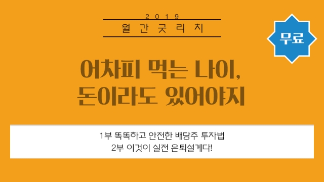 ◇ [2월 27일 수] 어차피 먹는 나이, 돈이라도 있어야지=통합 보험관리 플랫폼 굿리치와 뉴미디어 스타트업 사이다경제가 손잡고 2월 27일 19시 30분부터 서울 시청 한화센터에서 고객을 위한 재테크 세미나 ‘월간 굿리치’ 세미나를 개최한다. 이번 행사는 ‘어차피 먹는 나이, 돈이라도 있어야지’라는 주제로 똑똑하고 안전한 배당주 투자법과 은퇴설계에 대한 강의가 진행된다.