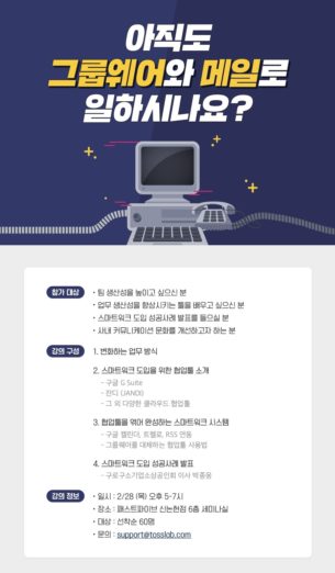 ◇ [2월 28일 목] 변화하는 업무방식: 아직도 그룹웨어와 메일로 일하시나요?=업무 커뮤니케이션 툴 잔디가 팀 생산성 향상을 위한 스마트워크 세미나를 2월 28일 17시부터 패스트파이브 신논현점에서 개최한다. 이번 세미나에서는 업무 생산성 향상을 위해 구글 G스위트, 잔디 외 다양한 클라우드 협업툴 소개하고 업계별 스마트워크 성공사례를 공개할 예정이다. 스마트워크 전문가 잔디 공인 컨설턴트(JCC) 이광희 강사가 진행할 예정. 행사에 대한 자세한 내용은 이곳에서 확인할 수 있다.