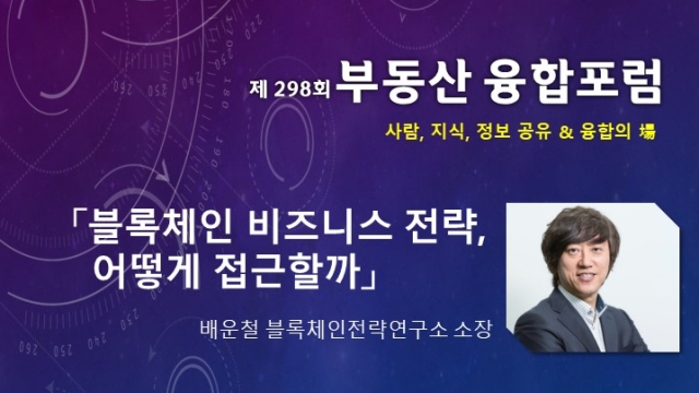 ◇ [2월 26일 화] 제298회 부동산 융합포럼: 블록체인 비즈니스 전략=한국부동산개발협회와 한국M&A융합센터, 비즈뷰가 공동 주최하는 제298회 부동산 융합포럼이 2월 26일 역삼동 대아빌딩 3층 한경아카데미 강남캠퍼스에서 열린다. 이번 행사에는 블록체인 비즈니스 전략, 어떻게 접근할 것인가에 대해 배운철 블록체인전략연구소 소장의 강연으로 진행될 예정이다. 이번 행사에서는 블록체인 기술의 특징과 발전단계, 블록체인 비즈니스의 주요 이슈, 블록체인 비즈니스를 적용한 영화산업, 에너지산업 등을 이야기할 예정이다. 배운철 소장은 2009년부터 소셜미디어전략연구소 대표를 맡고 있다. 행사에 대한 자세한 내용은 이곳에서 확인할 수 있다.