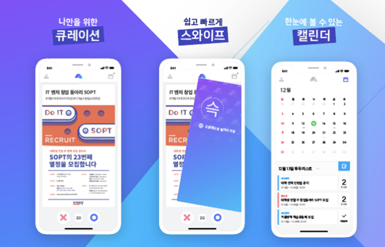 슥삭은 대학생이 대외 활동 정보를 찾는 시간을 획기적으로 줄여줄 수 있는 서비스로 대학생 벤처팀이 직접 기획 제작한 것이다. 큐레이션과 스와이프, 캘린더 3가지 핵심 기능을 통해 개인 관심 분야와 사용 행태에 맞춰 공모전 같은 대외 활동 정보를 추천해주고 스와이핑으로 원하는 정보만 저장할 수 있다. 또 일정을 캘린더에 자동 정리해 일목요연하게 확인할 수 있도록 했다.