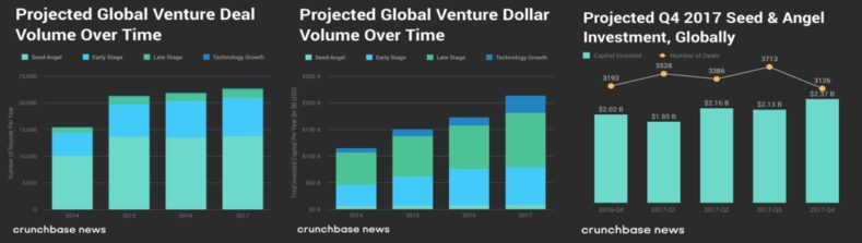 스타트업에 얼마나 투자되고 있을까. 2017년 4분기에 다소 주춤하는 경향은 있지만 전세계 벤처 투자는 지난 몇 년간 꾸준히 늘고 있다. 신생기업이 초기 투자를 받는 것은 여전히 쉬운 일은 아니지만 상황은 최근 3년 간 개선됐다. 크런치베이스에 따르면 2017년 전세계 벤처 투자 규모(전 투자 라운드 합계)는 2,136억 달러에 달했다.