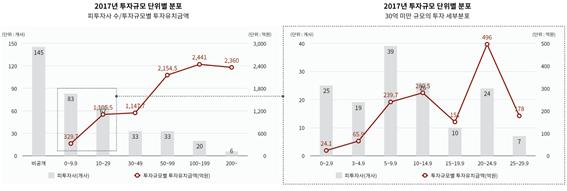 스타트업에 좀더 초점을 둔 자료를 살펴보자. 스타트업 전문 매체 <플래텀>은 대외적으로 공표된 스타트업 투자를 기준으로 연간 투자 동향 보고서를 발표하고 있다. 이에 따르면, 2017년 387개 스타트업에 425건의 투자와 29건의 인수합병이 이루어졌다. 투자에 참여한 기업은 251개로 총 9538억 원을 투자했다. 투자 건수는 전년 347건 대비 22.5% 증가했지만 투자 금액은 전년(10,078억 원)에 비해 5.4% 감소했다. 투자금 구간별로 살펴보면 10억 원 이하의 투자가 83건이었으며 200억 원 이상도 6건에 달했다.