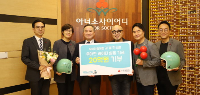 김봉진 우아한형제들 대표가 3월 18일 사랑의 열매 사회복지공동모금회에 음식 배달원 기금 20억 원을 기부했다. 지난 3월 초 저소득층 자녀 장학금 50억 원에 이어 추가 기부를 한 것. 이번 기부금은 음식 배달 중 사고를 당한 외식업 종사 라이더 의료비와 생계비 지원에 쓰일 예정이다. 김봉진 대표는 “보험조차 들기 어려운 처지에서 일을 하다 사고를 당한 라이더에게 치료비와 생활안정 자금을 지원해 조금이나마 힘이 되고 싶었다”며 “음식 배달원에 대한 사회적 관심과 배려가 더 커지길 바란다”고 전했다. 우아한형제들은 라이더 근무 여건 개선을 위해 보장 범위를 넓힌 라이더 보험을 운영하는 한편 매년 민트라이더 캠페인도 진행하고 있다.