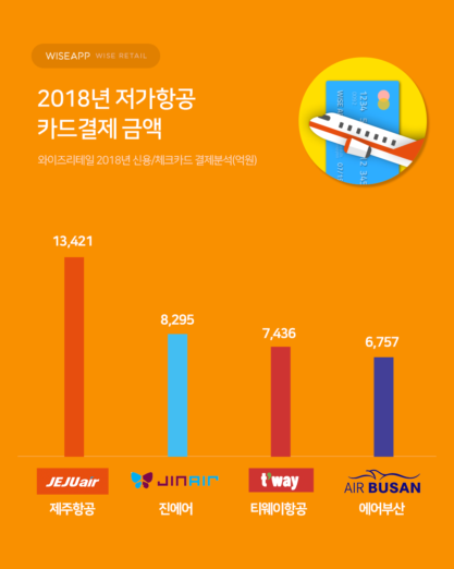 지난해 6개 저가항공에 사용된 카드 결제액이 4조 3,800억 원인 것으로 나타났다. 앱, 리테일 분석업체 와이즈앱에 따르면 지난해 한국인이 신용카드, 체크카드로 결제한 금액이 가장 큰 저가항공사는 1조 3,421억 원을 기록한 제주항공으로 조사됐다. 이어 진에어가 8,295억, 티웨이항공 7,436억, 에어부산’6,757억 순으로 나타났다.