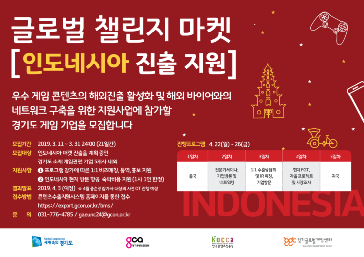 경기글로벌게임센터가 3월 31일까지 인도네시아 챌린지마켓 진출지원 프로그램 참가 기업을 모집한다.