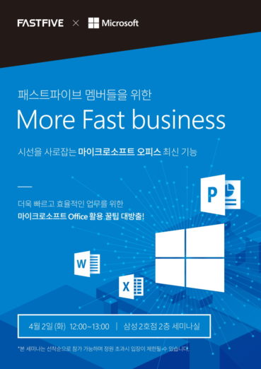 김대일 패스트파이브 공동대표는 “업무 환경의 유연성과 업무효율 최대화를 추구하는 스타트업과 글로벌 IT 솔루션 기업과의 콜라보 이벤트를 통해 대기업에서 스타트업에 이르는 다양한 패스트파이브의 입주 멤버들이 보다 생산성 높은 업무 환경에 대한 이해도가 높아질 것으로 기대한다”며 “지속적으로 국내 비즈니스 생태계를 구성하는 약 1만여 명의 멤버들의 더 나은 업무 환경을 위해 마이크로소프트 등 다양한 기업과의 협업을 진행해 나갈 예정”이라고 밝혔다.