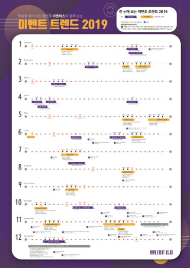안영학 이벤터스 대표는 “이번 배포는 행사와 이벤트 산업 활성화를 기여하기 위한 것”이라고 밝혔다. 행사를 기획하는 호스트라면 캘린더를 바탕으로 행사 일정 결정에 참고할 수 있고 참가자는 올해 주요 행사 일정을 한눈에 보고 계획을 미리 세울 수 있다. 이벤트 트렌드 2019는 PDF 파일 형태로 누구나 이곳에서 내려 받을 수 있다.
