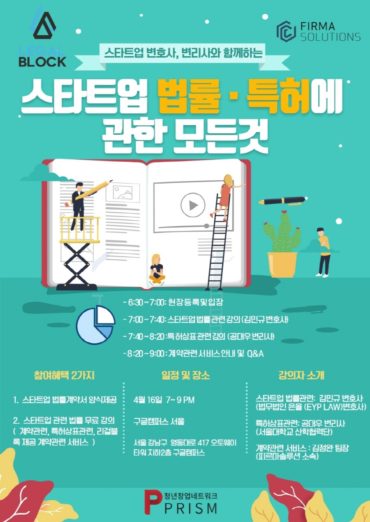 ◇[4월 16일 화] 스타트업 법률특허에 관한 모든 것=국내 최대 청년창업네트워크 프리즘과 리걸블록이 오는 4월 16일 구글캠퍼스 서울에서 ‘스타트업 법률·특허에 관한 모든 것’이라는 주제로 강연을 진행할 예정이라고 밝혔다.