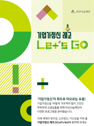 기업가정신 레츠고는 아산나눔재단이 지난해 8월 처음 시작한 기업가정신 교육 프로그램으로, 교사, 학부모, 교육 관계자 등에게 다양한 기업가정신을 함양하기 위한 교육법을 제공한다.