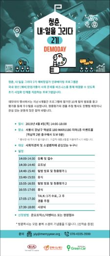‘청춘, 내:일을 그리다’ 데모데이는 2기로 선정된 스타트업들이 사업 성과를 발표하는 자리이며 사회적 경제 및 소셜 벤처에 관심있는 사람을 대상으로 한다. 신청은 이곳에서 할 수 있다.