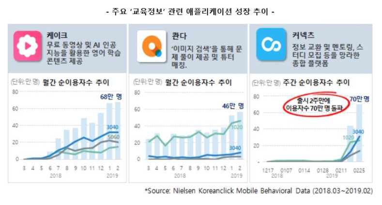에스티유니타스 측은 100만 다운로드가 교육용 앱 시장 성장과도 관계가 깊다고 설명하고 있다. 닐슨코리안클릭이 지난 3월 내놓은 보고서에 따르면 교육 관련 모바일 앱이 2018년에 들어서면서 제2의 성장기를 맞고 있다는 분석. 커넥츠 외에도 영어 학습 앱인 케이크, 문제 풀이와 튜터 매칭 앱인 콴다 등이 빠르게 사용자 수를 확보하면서 주목받고 있다.