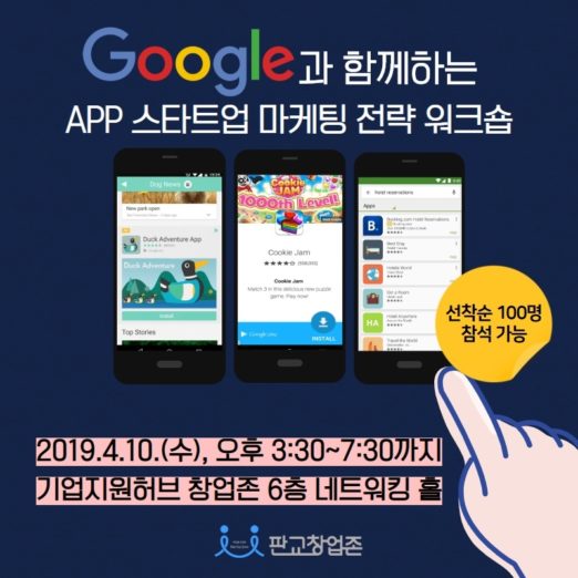 [410일 수] APP 스타트업 마케팅 전략 워크숍=창업지원 클러스터 판교창업존이 4월 10일 15시 30분부터 판교제2테크노밸리에서 스타트업 마케팅 전략 워크숍을 진행한다. 이번 전략 워크숍은 구글과 함께 APP 스타트업 마케팅 전략에 대해 다룰 예정이다.