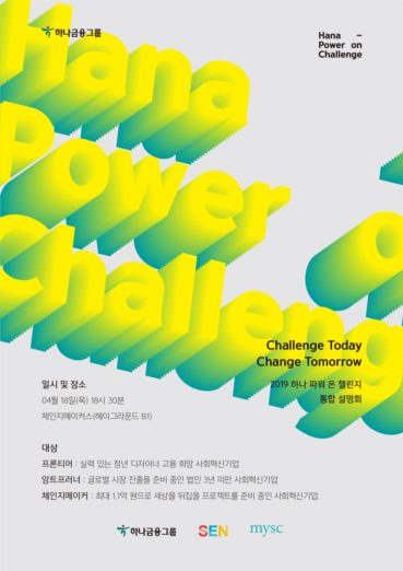 [418일 목] 2019 하나 파워 온 챌린지 통합 설명회=하나금융그룹이 4월 18일 18시 30분부터 서울 뚝섬로 헤이그라운드 지하 1층 체인지메이커스에서 ‘2019 하나 파워 온 챌린지’ 통합 설명회를 개최한다.