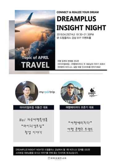 [425일 목] 드림플러스 스타트업 인사이트 나잇=한화생명 드림플러스가 월 1회 비즈니스 업계를 선도한 스타트업 대표의 이야기를 듣는 인사이트 토크쇼 ‘드림플러스 인사이트 나잇’을 4월 25일 서울 드림플러스 강남에서 개최한다. 이번 토크쇼에서는 여행 업계의 변화를 선도한 자유여행플랫폼 마이리얼트립 이동건 대표의 창업 이야기와 SNS 채널에 최적화된 여행 콘텐츠를 제작하는 대한민국 대표 여행문화 기획소 여행에미치다 조준기 대표가 여행 콘텐츠 트렌드에 대하여 이야기할 예정. 행사에 대한 자세한 내용은 이곳에서 확인할 수 있다.
