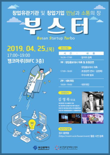 [425일 목] 부산 창업기업 소통의 장, 부스터=부산광역시와 부산창조경제혁신센터가 손잡고 부산 지역 창업 스타트업 활성화를 위해 창업유관기관과 창업기업이 만날 수 있는 자리를 4월 25일 부산국제금융센터(BIFC) 3층 캠포마루에서 마련한다. 이번 행사는 창업유관기관과 창업기업의 만남과 소통을 목표를 가지고 부스터(Bustur. Busan Startup Turbo)를 슬로건으로 내걸었다. 행사에서는 창업홍보대사 위촉과 넥스트챌린지 김영록 대표 강연, 스타트업 우수사례 발표와 함께 참석자 간의 네트워킹 자리도 마련한다. 행사에 대한 자세한 내용은 이곳에서 확인할 수 있다.