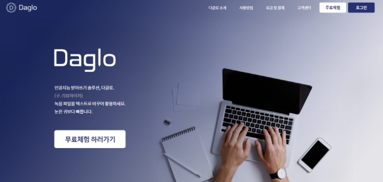 다글로는 음성 파일을 업로드하면 텍스트로 자동 전환하는 웹서비스다. 앞선 버전인 리뷰와이저에 음성인식 엔진을 추가해 정확도를 크게 95%까지 높였으며 이를 먼저 확인할 수 있도록 5분 미리듣기도 지원한다. 또 키워드 검색, 재생중인 단어 표시, 재생속도 조절, 화자 표시를 비롯한 기능도 추가됐다.