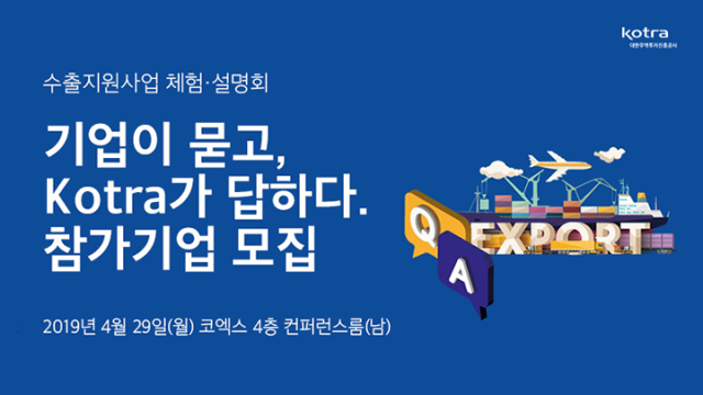 ◇[4월 29일 월요일] = 수출지원사업 체험·설명회: 기업이 묻고, KOTRA가 답하다 = 대한무역투자진흥공사(kotra)에서 우리 기업의 수출활력 제고를 위해 수출지원사업 체험·설명회를 오는 4월 29일 월요일 오후 1시부터 코엑스 4층 컨퍼런스룸에서 개최한다. 이번 행사에서는 수출을 하려는 기업들이 마주라는 6가지 질문을 선정하여 KOTRA 해외근무 경험자와 1대1 상담, 글로벌 주요산업 트렌드 브리핑, AMAZON 활용방법 설명회 등 예정되어 있다. 아울러 수출역량테스트(GCL), 수출유망시장발굴(빅봇), 법무·관세 등 다양한 주제로 부스를 마련하고 기업들이 자유롭게 수출지원 프로그램을 직접 체험하고 애로를 상담할 예정이다. 행사에 대한 자세한 내용과 신청은 이곳에서 할 수 있다.