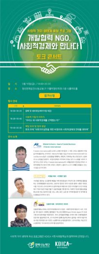 ◇[5월 10일 금요일] = 개발협력 NGO, 사회적경제와 만나다 토크콘서트= 열매나눔재단과 KOICA(한국국제협력단)에서 사회적 가치 생태계 육성 프로그램 개발협력 NGO, 사회적경제와 만나다 토크콘서트를 오는 5월 10일 금요일 오후 6시부터 서울 동교동 청년문화공관JU동교동에서 개최한다. 행사는 사회적 기업가 이야기와 “사회가치실현을 위한 비영리와 사회적경제의 연대를 위하여”를 주제고 패널토의와 질의응답을 진행할 예정이다. 행사는 △Friends International Nikolai Schwarz, Head of Social Business, △사단법인 캠프 이철용 대표 △라이프라인 코리아 김동훈 대표가 연사로 참여할 예정이다.