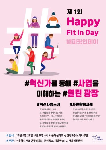 ◇[4월 25일 목요일] = 서울혁신파크 2019 해피핏인데이 = 서울혁신파트에서 오는 4월 25일 목요일 오후 4시부터 서울혁신파크 상상청2층 느티나무홀에서 혁신가를 통해 사업을 이해하는 열린 광장 제 1회해피핏인데이를 개최한다. 이번 행사는 사회 혁신사업가, 서울혁신파크 내 입주자, 소셜미션을 지원하고 그 해결에 함께하는 민간과 공공, 사회적가치를 가진 사업을 발굴하여 투자/지원하는 외부 이해관계자 등을 대상으로 하며 혁신사업소개와 자원활용사레에 대해 이야기할 예정이다.