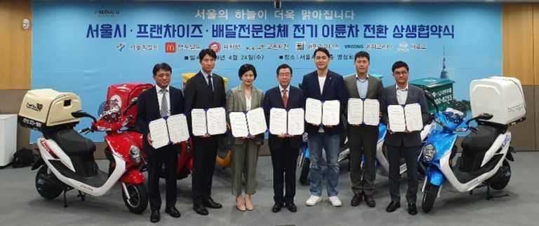 서울시가 4월 24일 서울시청 영상회의실에서 프랜차이즈·배달전문업체와 전기 이륜차 전환 상생협약식을 열었다. 이 자리에는 맫도날드와 피자헛, 교촌치킨 등을 비롯한 프랜차이즈 업체 외에 배민라이더스와 메쉬코리아, 바로고 등 물류 배송 스타트업 6곳이 함께 했다. 현재 서울시에 등록된 이륜차는 모두 44만 6,000대. 이 가운데 프랜차이즈와 배달 업체 등에서 이용하는 이륜차는 10만대다. 이번 협약에 따라 참여기업 6곳은 전기이륜차 1,050대를 보급하고 전기이륜차 전환에도 적극 협력할 방침. 또 엔진이륜차를 새로 구입하거나 교환할 때 전기이륜차 도입을 우선 검토하는 등 서울시 미세먼지 저감 사업에 동참하게 된다. 서울시는 이를 위한 예산을 따로 확보해 적기에 지원할 예정. 협약식에 참석한 박원순 서울시장은 “이번 업무협약이 민관 협력으로 생활권 미세먼지 그물망 대책의 실효를 거두는 모범적 사업 모델이 되기를 기대한다”면서 “더 많은 시민과 민간업체의 자발적 참여와 협조를 바탕으로 생활 곳곳에 산재한 미세 오염원까지 촘촘하게 관리해 나가겠다”고 말했다. 이 자리에 참석한 이태권 바로고 대표는 “라이더의 더 나은 근무 환경을 위해 미세먼지 저감 대책 필요성을 느껴 서울시의 미세먼지 저감 사업에 동참하게 됐다”고 밝혔다. 또 부릉을 운영 중인 메쉬코리아 측은 4월초 매스아시아와 전기 자전거 사업 협력을 위한 MOU를 체결하고 전기자전거 도입을 준비 중이라고 설명했다. 박준규 메쉬코리아 COO는 “전기이륜차와 전기자전거 등 배송에 특화된 다양한 이동수단에 대한 투자를 확대해 나갈 계획”이라고 설명했다.