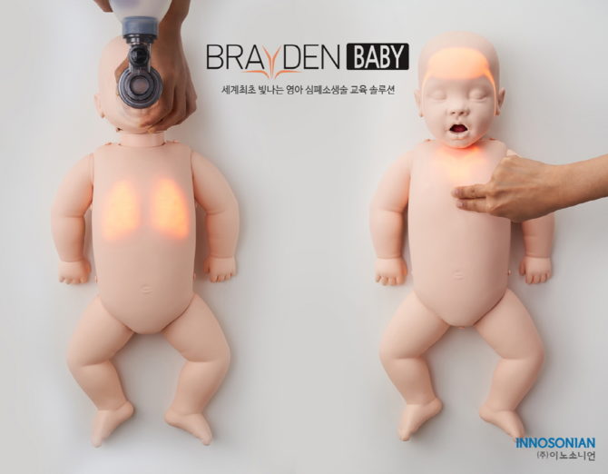 브레이든 베이비는 심폐소생술 훈련용 마네킹. 스마트 기기 1대에 마네킹 6대를 동시 연동할 수 있고 가슴 압박 깊이와 속도, 이완, 위치 등을 곧바로 분석해 교육생 훈련을 효율적으로 진행할 수 있다.