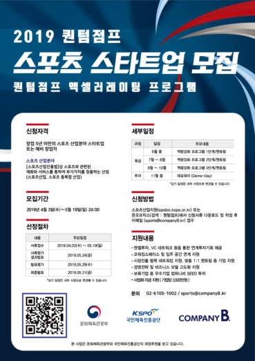 컴퍼니비가 5월 19일까지 국민체육진흥공단과 퀀텀점프 액셀러레이팅 프로그램 참여 기업을 모집한다고 밝혔다.
