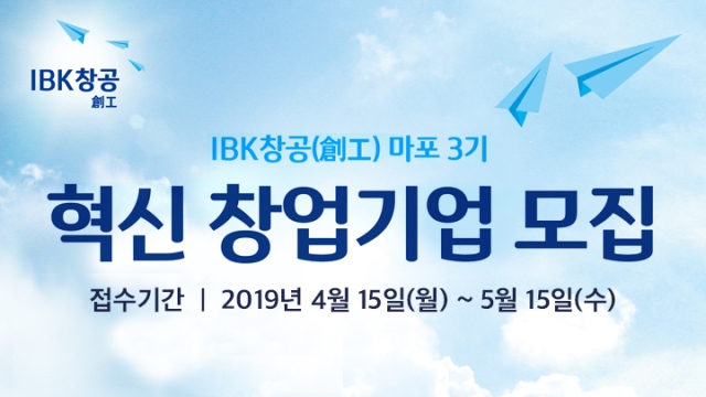 ◇[4월 23일 ~ 5월 15일] IBK창공(創工) 마포 3기 혁신 창업 기업 모집= IBK기업은행이 IBK창공(創工) 마포 3기 혁신 창업기업을 오는 5월 15일까지 모집한다. IBK창공은 창업기업이 성공적으로 사업모델을 구축하도록 투·융자, 컨설팅, 사무공간 등 금융·비금융 서비스를 지원하는 창업육성 플랫폼이다.