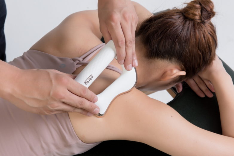 스트릭(Strig)은 IASTM(Instrument Assisted Soft Tissue Mobilization), 그러니까 도구를 이용해 문질러서 치료하는 셀프 마사지기다. 진동과 미세전류로 작동하는 블레이드 부분을 피부에 문질러 근육을 이완시켜주는 디지털 헬스케어 디바이스인 것. 12,000rpm 미세 진동으로 근육 이완을 돕고 몸에 흐르는 전류와 비슷한 양의 미세전류를 흘려보내 근육을 구성하는 콜라겐 합성을 돕고 근육 회복을 촉진해준다.