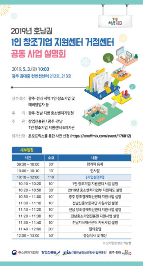 전남정보문화산업진흥원 1인 창조기업 지원센터가 5월 3일 김대중컨벤션센터에서 2019년 공동 사업설명회를 개최한다고 밝혔다.