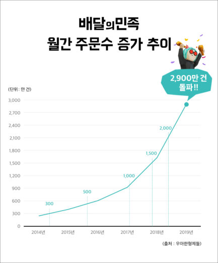월간 주문수도 4월 말 기준 약 2,907만 건으로 3천만 건에 근접하고 있다. 하루 평균 100만 건, 매일 100만 가구가 배민을 통해 한 끼 식사를 해결하는 셈이다. 배달의민족의 주문 수 또한 2015년 5월 500만 건, 2017년 1월 1000만 건, 2018년 7월 2000만 건 등 매년 급증하고 있다.