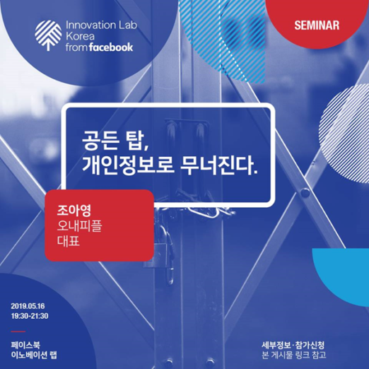 오내피플이 페이스북 이노베이션랩과 5월 16일 ‘공든 탑, 개인정보로 무너진다’ 세미나를 연다고 밝혔다.