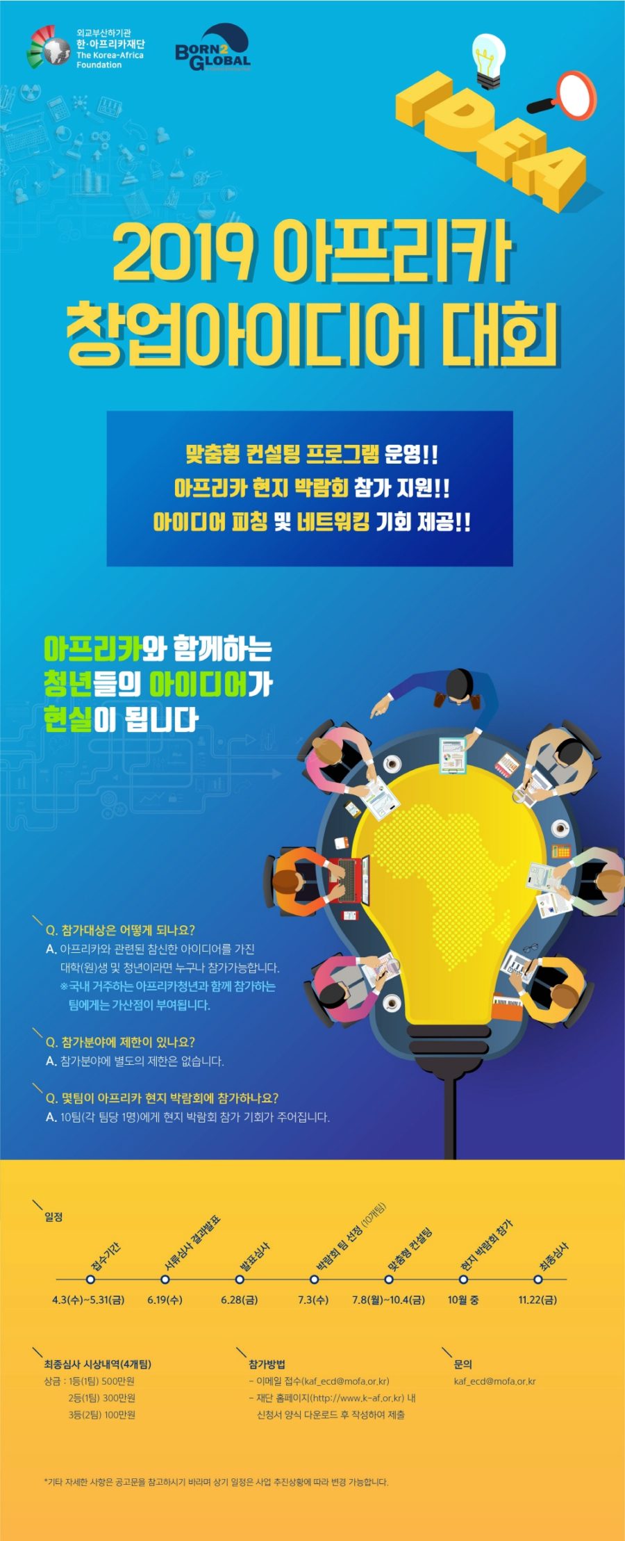 아이디어는 5월 31일까지 제출하며 선정된 10개팀에게는 맞춤형 컨설팅, 10월 아프리카 현지에서 개최하는 스타트업박람회 참여 기회를 부여한다. 박람회 이후 11월 최종 심사를 통해 수상팀에게는 1등 500만원, 2등 300만원, 3등 2팀 각 100만원 등 창업지원금도 수여한다.
