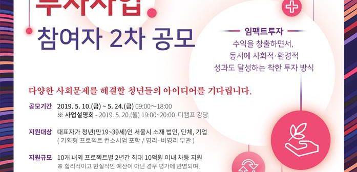 서울시가 2019 청년프로젝트 투자사업 2차 참여자를 모집한다고 14일 밝혔다. 2019 청년프로젝트 투자사업은 청년의 사회혁신 프로젝트를 발굴·투자해 사회문제를 해결하고 좋은 일자리를 창출하기 위해 마련된 사회문제 해결형 임팩트 투자 사업이다. 주관기관으로는 임팩트 투자 전문기업 크레비스파트너스가 참여한다. 해당 사업은 사업 취지에 적합한 프로젝트 선발을 위해 총 두 차례에 걸쳐 모집을 진행했다. 지난 3월 1차 모집에 이어 이번이 2차 모집이다. 선발기업은 사업비 지원과 더불어 프로젝트 기획, 경영 컨설팅, 홍보 마케팅, 실무자 교육 등 다양한 혜택을 제공받게 된다. 대표자가 청년(만19세~39세)인 서울시 소재 법인, 단체, 기업이면 영리·비영리 상관없이 누구나 참여가 가능하다. 접수기간은 5월 10일부터 24일까지다. 5월 20일에는 역삼동 디캠프에서 사업 설명회가 진행될 예정이다. 주관기관인 크레비스파트너스 측은 프로젝트 별 2년간 최대 10억 원까지 보조금이 지급되는 점을 본 사업의 특징으로 꼽았다. 김원영 크레비스파트너스의 총괄이사는 “해당 사업은 투자 금액의 규모가 크고 장기적인 지원이 가능하다”며 “때문에 공공문제 해결 등 쉽게 도전하기 힘든 프로젝트를 시도해 볼 수 있을 뿐만 아니라 장기적인 성과 창출에 집중할 수 있다는 장점”이라고 밝혔다. 김영경 서울시 청년청장은 “본 사업은 청년에 의한 청년을 위한 사업”이라며 “사회의 수혜자가 아닌 적극적인 해결자로서 혁신적인 사업모델에 도전하고자 하는 많은 청년들의 지원을 기다린다”라고 말했다. 모집에 대한 자세한 내용은 서울청년포털에서 확인할 수 있으며 사업설명회 신청은 온오프믹스에서 가능하다.