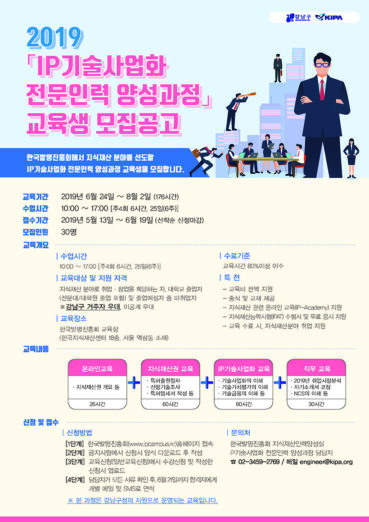 한국발명진흥회는 ‘IP기술사업화 전문인력 양성과정’에 참여할 교육생을 6월 19일까지 모집한다고 17일 밝혔다. 해당 교육은 6월 24일부터 8월 2일까지 역삼동 한국발명진흥회에서 무료로 실시되며 ▲지식재산권·IP기술사업화 관련 이론 ▲선행기술검사 분석, 특허 명세서 작성 등 실습 ▲2019년 취업동향 분석 및 자기소개서 작성 등 직무강의로 진행된다.