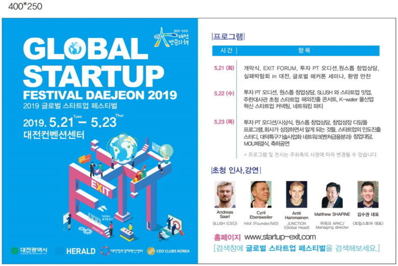 이번 행사에는 핀란드 슬러시 CEO, 헥스 설립자, 정션 대표, 위워크 아태 총괄 디렉터 등이 참석해 기조 연설과 투자상담을 진행할 예정. 행사 기간 중에는 국내외 투자자에게 스타트업이 투자PT오디션을, 현장 1:1 원스톱 창업상담, 스타트업 창업 전시를 진행한다. 또 슬러시와 스타트업 밋업, 주한대사관 초청 스타트업 해외 진출 토크 콘서트, 스타트업 인도 진출 스터디, 성공 스타트업 CEO 만남, 대덕특구 기술사업화 네트워크 창업 상담을 다채로운 프로그램을 진행한다.
