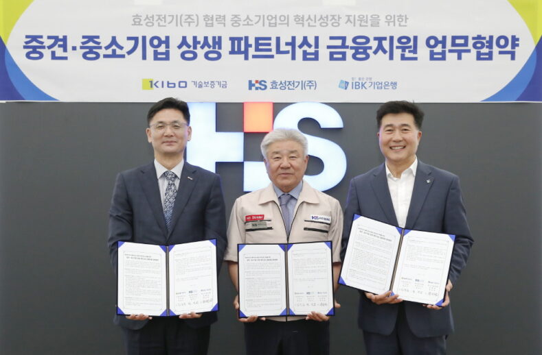 기술보증기금이 효성전기, 중소기업은행과 중견·중소기업 상생 파트너십 금융지원 업무협약을 체결했다.