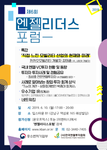 ◇ [6월 10일 월] 제6회 엔젤리더스포럼=한국엔젤투자협회가 주최하는 2019년 제6회 엔젤리더스포럼이 6월 10일 17시 역삼 팁스타운 S1에서 열린다. 엔젤리더스포럼은 전문엔젤투자자 중심 포럼으로 엔젤투자 동향과 정책/제도, 창업팀 발굴의 장이며 매월 진행된다. 이번 발표에는 ㅿ한국엔젤투자협회 이인수 팀장이 ‘국내·외 엔젤 투자동향’ ㅿ한국벤처캐피탈협회 이기백 부장이 ‘국내 VC 투자동향’ ㅿ카카오모빌리티 개발자 강태훈 (前, UBER 개발자)이 ‘직접 느낀 모빌리티 산업의 현재와 미래’에 대한 특강과 ㅿ최성호 전문엔젤투자자가 ‘투자자 투자 사례와 경험 공유’ ㅿ삼화회계법인 박종대 회계사가 ‘사례로 알아보는 창업·투자 회계 상식’을 이야기할 예정이다. 또 ㅿ유지보수에 관한 모든 서비스를 책임지는 원스톱 프리미엄 홈/빌딩 관리 플랫폼 ’워커맨’, ㅿ퇴비화 환경에서 100% 자연 분해 가능한 친환경 빨대 ’자연에버리다’, ㅿ영유아용 개별 밀폐 냄새차단 휴지통 ‘테바’, ㅿXR을 위한 물리적 유사 촉감 전달 글러브’ 폴다이브테크놀로지’, ㅿ전기차 배터리 및 전자제품 방열을 위한 고전도성 신소재 ‘피앤비소재’ 5개 유망 스타트업의 IR도 진행할 예정이다. 행사에 대한 자세한 내용은 이곳에서 확인할 수 있다.